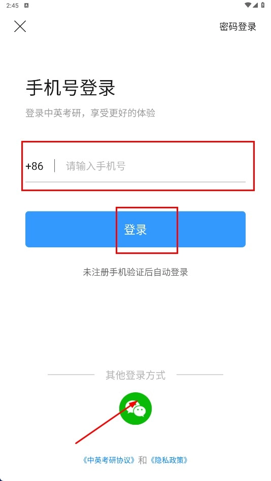 4、在手机号登录页面,输入手机号后点击【登录-功能按钮】,或选择微信等其他登录方式登录。