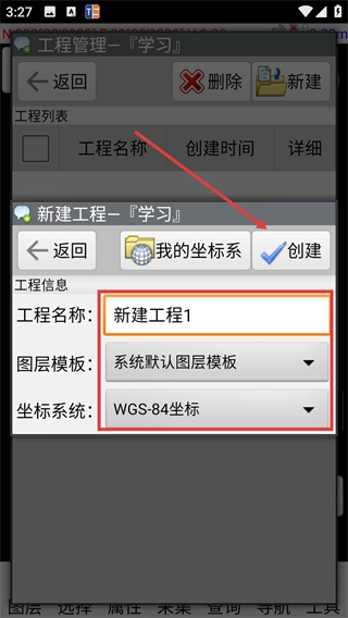 2、在新建工程界面设置工程名称、图层模板和坐标系统后,点击【创建】按钮。