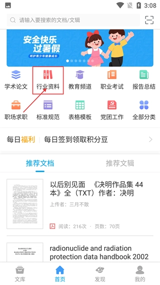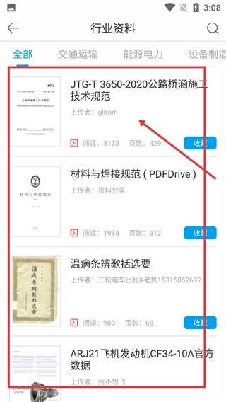 1、打开软件首页后,点击【行业资料】分类入口,即可进入行业资料板块,该板块内还设有【交通运输】【能源电力】等细分领域。