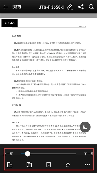 4、进入资料阅读界面,可查看当前页码和总页数,使用【上一页】【下一页】功能翻页,还能进行目录查看、添加书签、分享等操作。