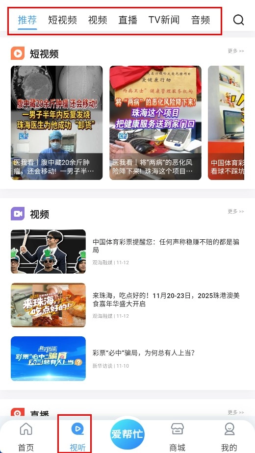 4、点击底部【视听-功能按钮】,进入视听页面,可选择短视频、视频等分类查看内容。