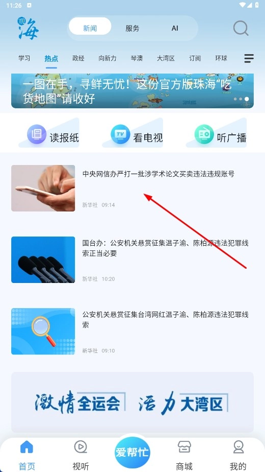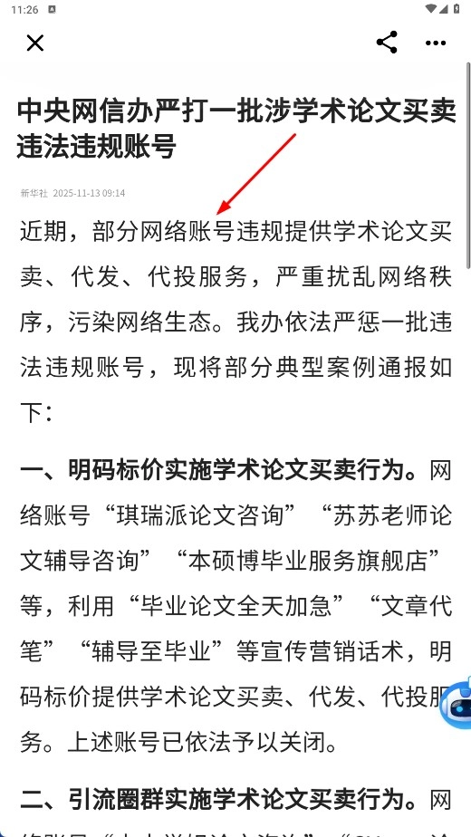2、在新闻页面点击感兴趣的新闻条目,如【中央网信办严打涉学术论文买卖账号-新闻标题】,查看新闻详情。