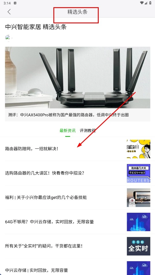 4、在【精选头条-分类标签】,进入精选头条页面,可查看如路由器评测、选购建议等资讯内容。