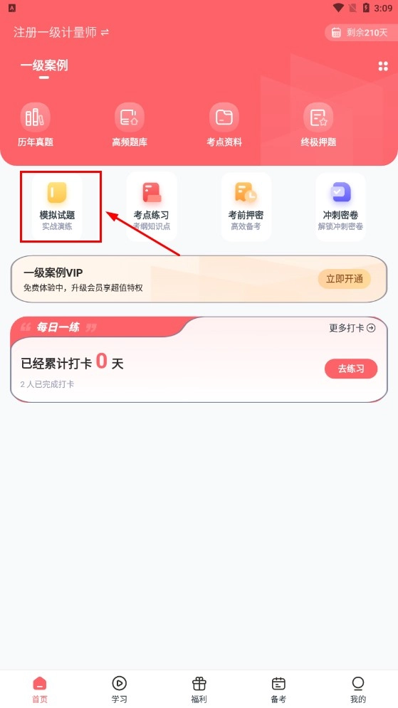 2、进入注册一级计量师页面后,点击【模拟试题-功能模块】,进入试卷详情页。