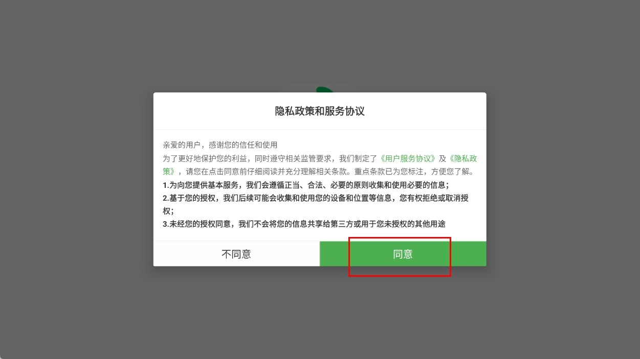 1、点击【同意-隐私政策和服务协议】按钮,即可进入登录界面。