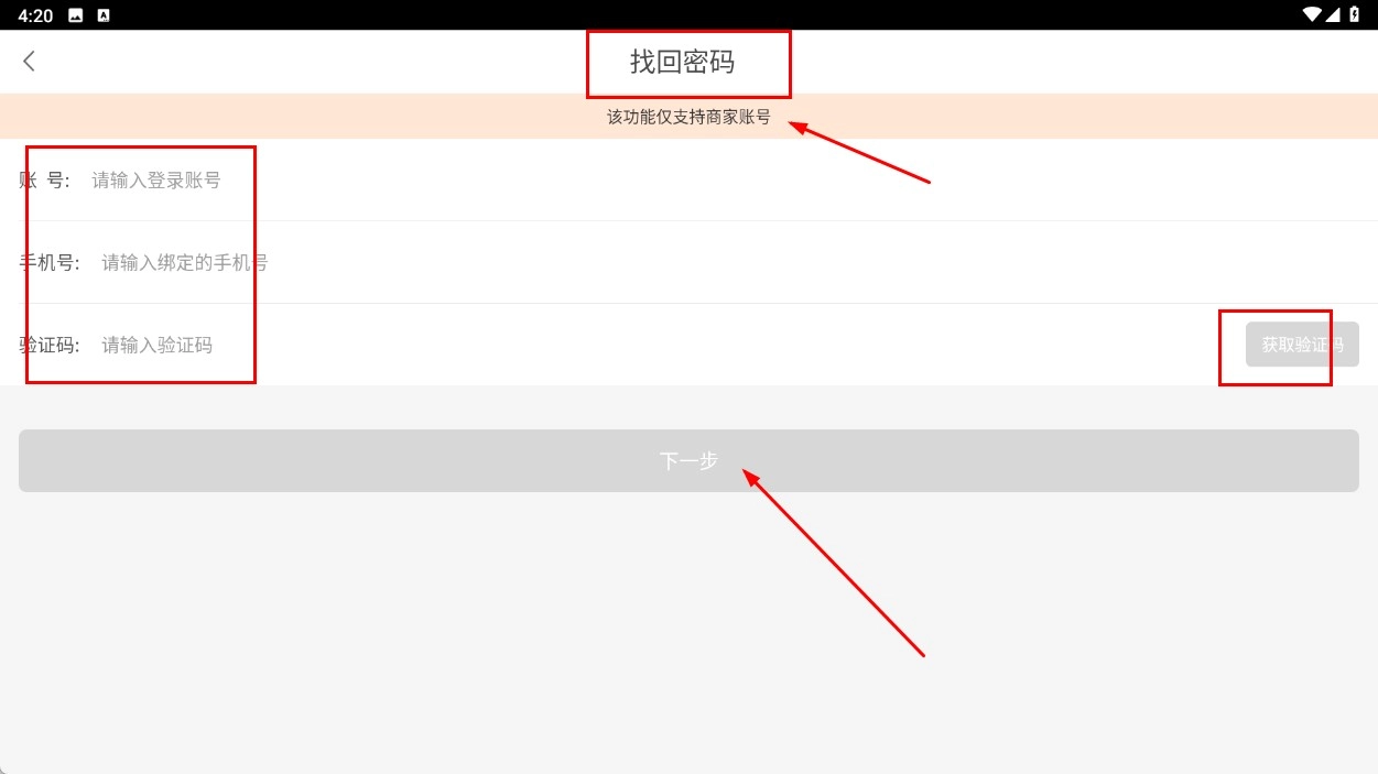 3、若忘记密码,进入找回密码页,输入【账号】【手机号】,获取并填写验证码后点击下一步按钮。