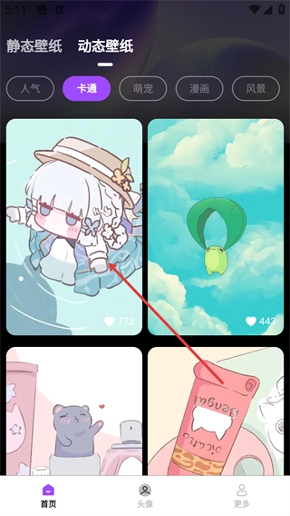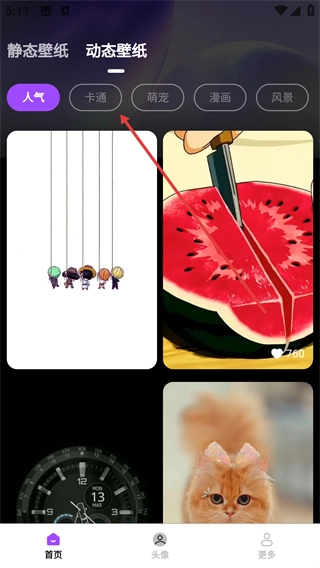 2、在动态壁纸分类界面点击【卡通】分类,筛选出卡通类动态壁纸。