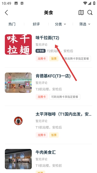 4、在导航页面,查看【味千拉面(T2)】的具体位置信息,包括航站楼、安检前后及详细方位。