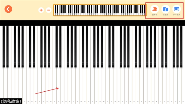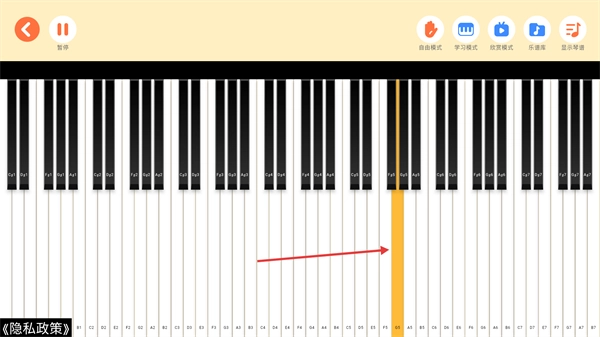 3、进入弹奏界面后,钢琴键会有黄色提示,跟随提示弹奏即可,也可根据需要切换模式。
