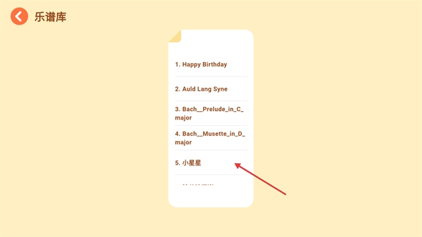 2、在【乐谱库】中,选择想要弹奏的曲目,如【小星星】,进入曲目弹奏界面。
