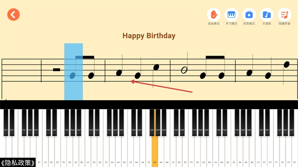 4、点击【显示琴谱】,可查看曲目《Hy Birthday》的琴谱,结合琴谱和钢琴键提示进行弹奏。