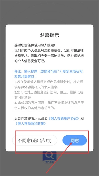 打开【懒人搜题】后,点击【同意】按钮就能进入应用,若选择“不同意”,则会退出应用。