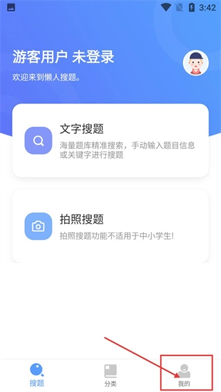 2、进入应用首页,可使用文字搜题、拍照搜题功能,点击底部【我的】选项进入个人中心。