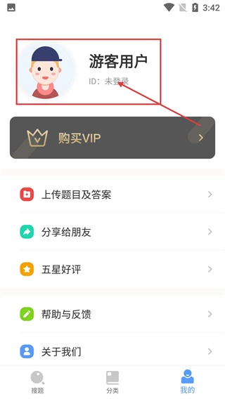 3、在个人中心页面,点击【游客用户】区域,即可进入账号登录流程,该页面还包含上传题目、分享等功能入口。