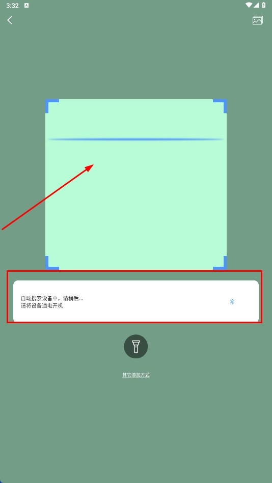2、在添加页面,等待自动搜索设备,确保设备通电开机或直接扫码连接。
