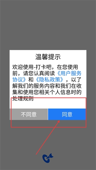 1、在温馨提示界面,点击【同意】按钮后,即可进入打卡吧的登录界面。