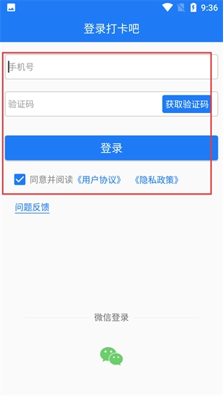 2、在登录打卡吧界面,输入手机号,获取并填写验证码,点击【登录】,或选择微信登录即可完成登录操作。