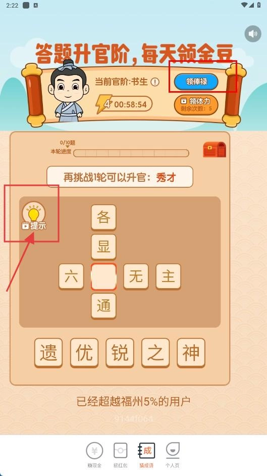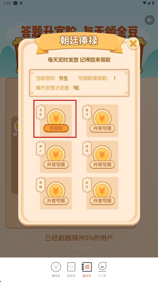4、点击【领俸禄-功能按钮】,进入朝廷俸禄领取页面,点击【可领取-功能按钮】领取当前官阶对应的俸禄。