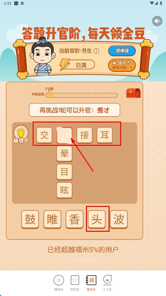 1、在答题界面,依据题目给出的提示点击对应的文字,就能完成成语填空操作,比如点击“头”字即可填好“交头接耳”这个成语。