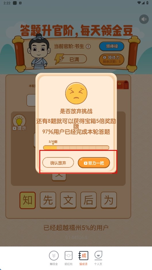3、若出现是否放弃挑战的弹窗,可选择【确认放弃】或【努力一把】继续答题。