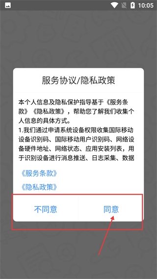 进入应用后,会弹出【服务协议/隐私政策】的弹窗,阅读相关条款并点击【同意】按钮,就能进入应用的引导页面。