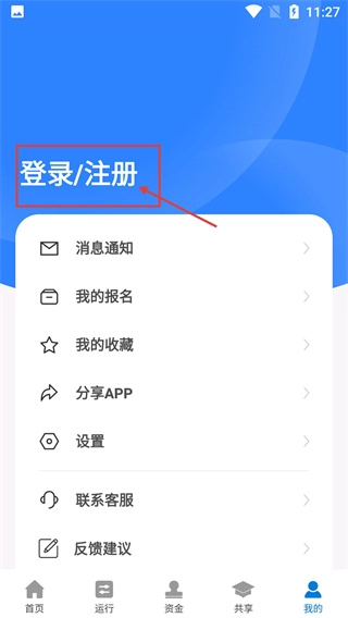 2、在个人中心界面,点击【登录/注册】区域,可进入登录注册界面。