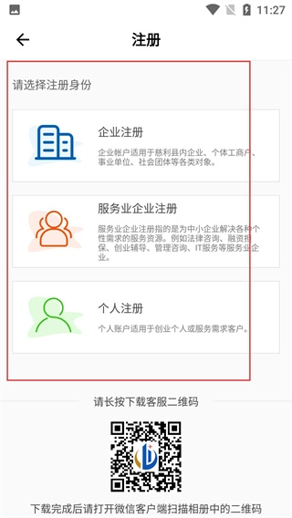 4、在注册身份选择界面,可根据自身情况选择【企业注册】【服务业企业注册】或【个人注册】进行注册。