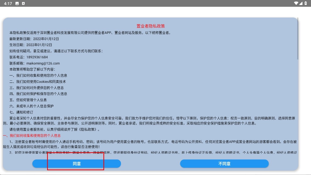1、点击【同意】按钮,接受置业者隐私政策后即可进入平台。