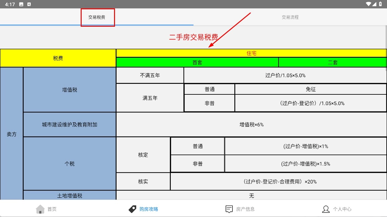 3、在购房攻略,进入【交易税费-板块】,了解二手房交易税费详情。