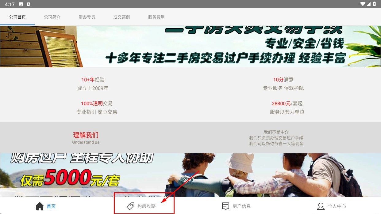 2、在首页点击【购房攻略-入口】,查看购房相关知识。