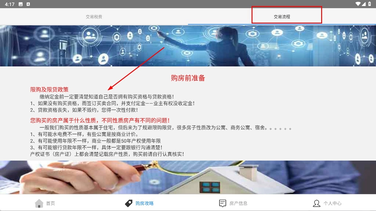 4、切换到【交易流程-板块】,查看购房前准备等交易流程信息。