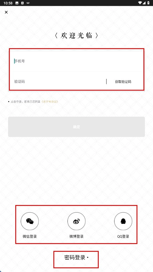 3、在登录页,可选择输入手机号、验证码,点击确定登录;也可选择微信、微博、QQ第三方登录方式。