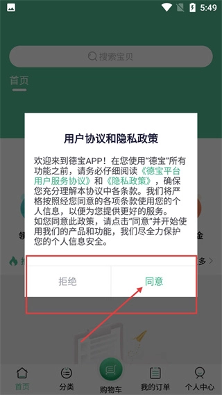 2、在【用户协议和隐私政策】界面,点击【同意】按钮,进入首页。