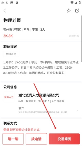 4、在职位详情界面点击【投递简历】按钮,完成简历投递操作。