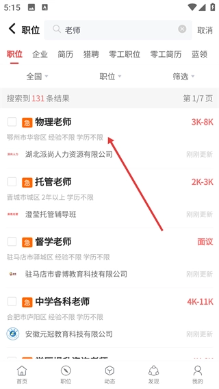 3、在搜索结果中点击目标职位,如“物理老师”,进入职位详情界面。
