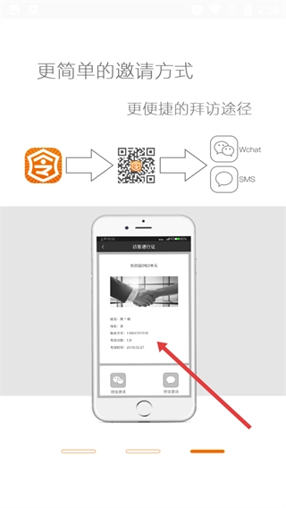 2、在功能展示页面,了解访客通行证的邀请方式,可通过微信、短信等途径发送。