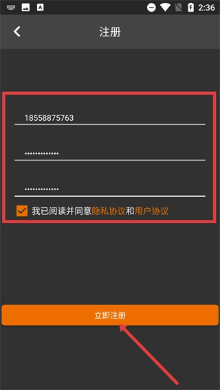 4、在注册页面,填写手机号、密码,勾选同意协议后,点击【立即注册】,完成账号注册操作。