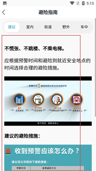 2、在避险指南页面,可查看通用建议,包括“不慌张、不跳楼、不乘电梯”等核心避险原则。