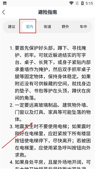 3、点击【室内】标签,可查看室内避险措施,如保护头部、远离危险物体、不使用电梯等。