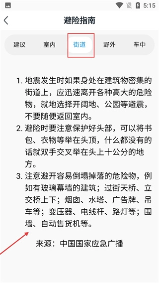 4、点击【街道】标签,可查看街道避险措施,如远离高大危险物、保护头部、避开易倒塌物体等。