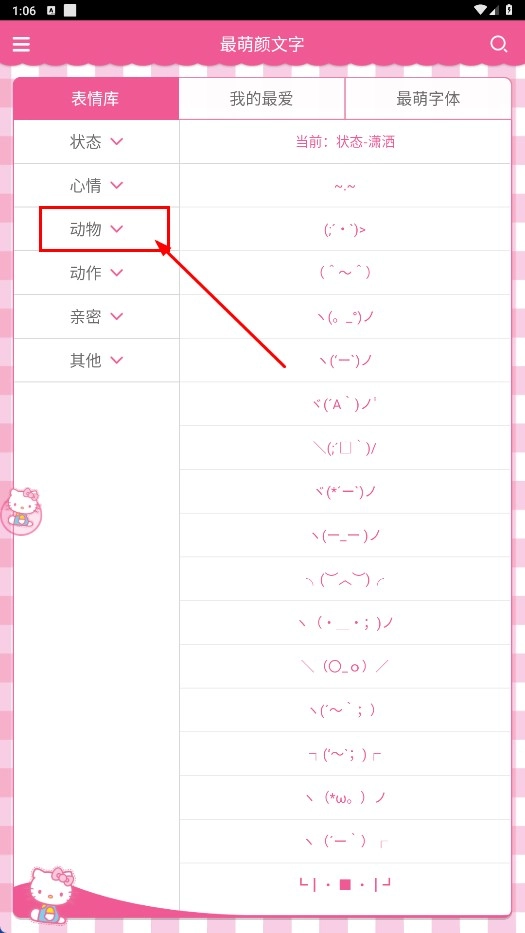 2、在主界面点击【动物-分类标签】,展开动物类颜文字分类。