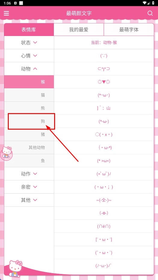 3、在动物分类选择【狗-子分类】,查看狗类颜文字列表。