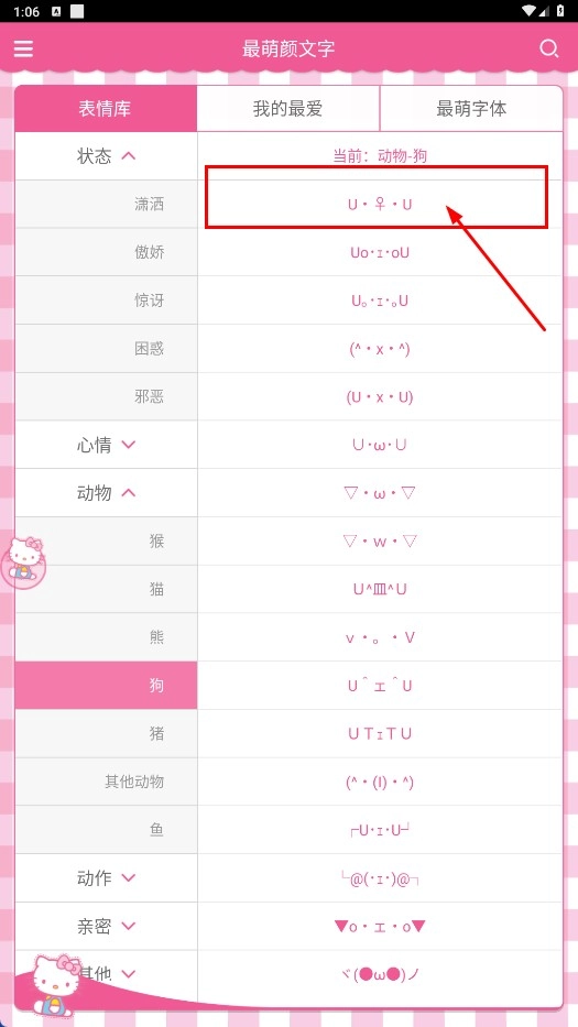 4、在狗类颜文字列表,可选择如“U・♀・U”等颜文字使用,点击即可复制粘贴。
