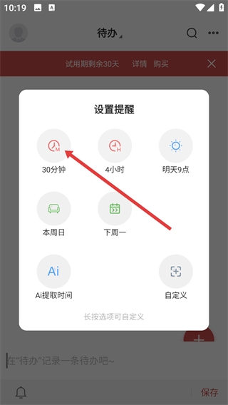 3、在设置提醒列表中选择【30分钟】等提醒时间选项,可设置待办事项的提醒时间。