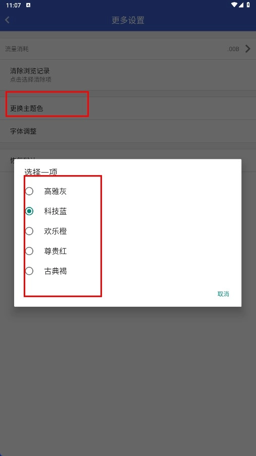 4、在设置页面,点击【更换主题色-功能选项】,选择高雅灰、科技蓝等主题色。