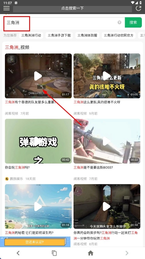 2、在搜索框输入【三角洲-关键词】,点击搜索查看相关视频内容。