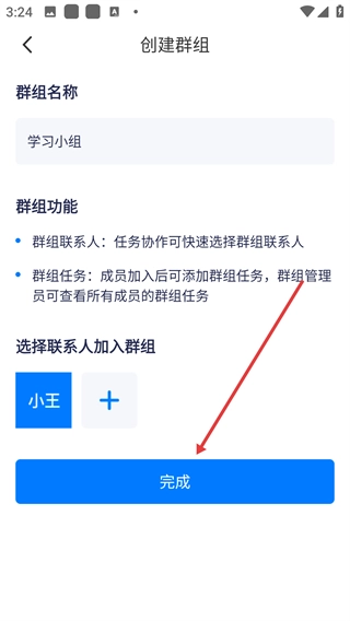 4、回到创建群组界面,点击【完成】按钮,完成群组创建操作。