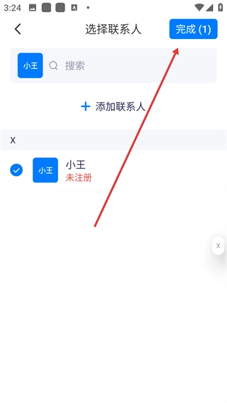 3、在选择联系人界面选择联系人,如“小王”,点击【完成】。