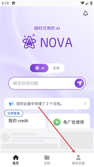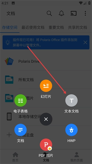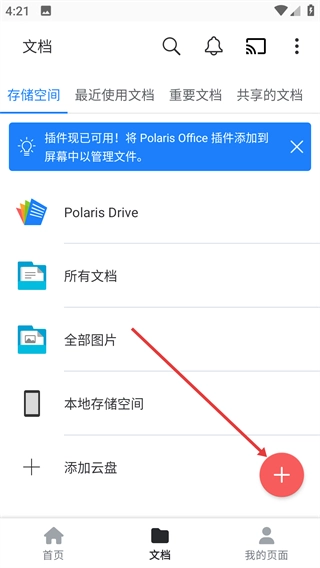 2、在文档页面点击红色“+”按钮,展开创建选项菜单。