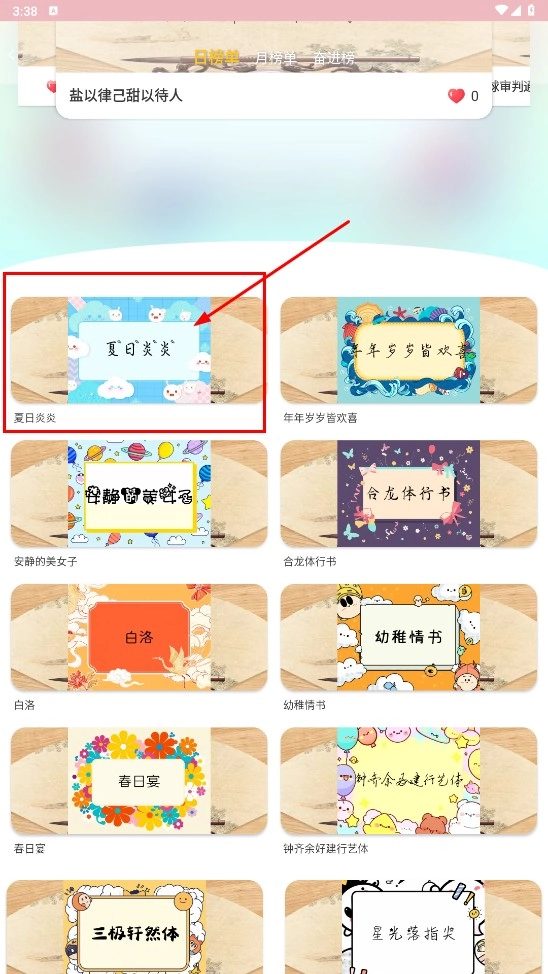 2、在字体榜单,选择心仪的字体(如“夏日炎炎”)。